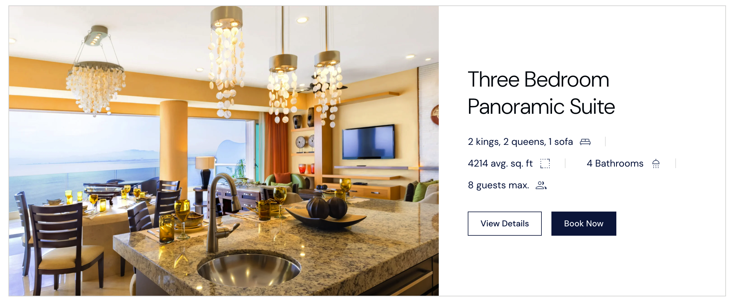 2 kings, 2 queens, 1 sofa| 4214 avg. sq. ft| 4 Bathrooms| 8 guests max.