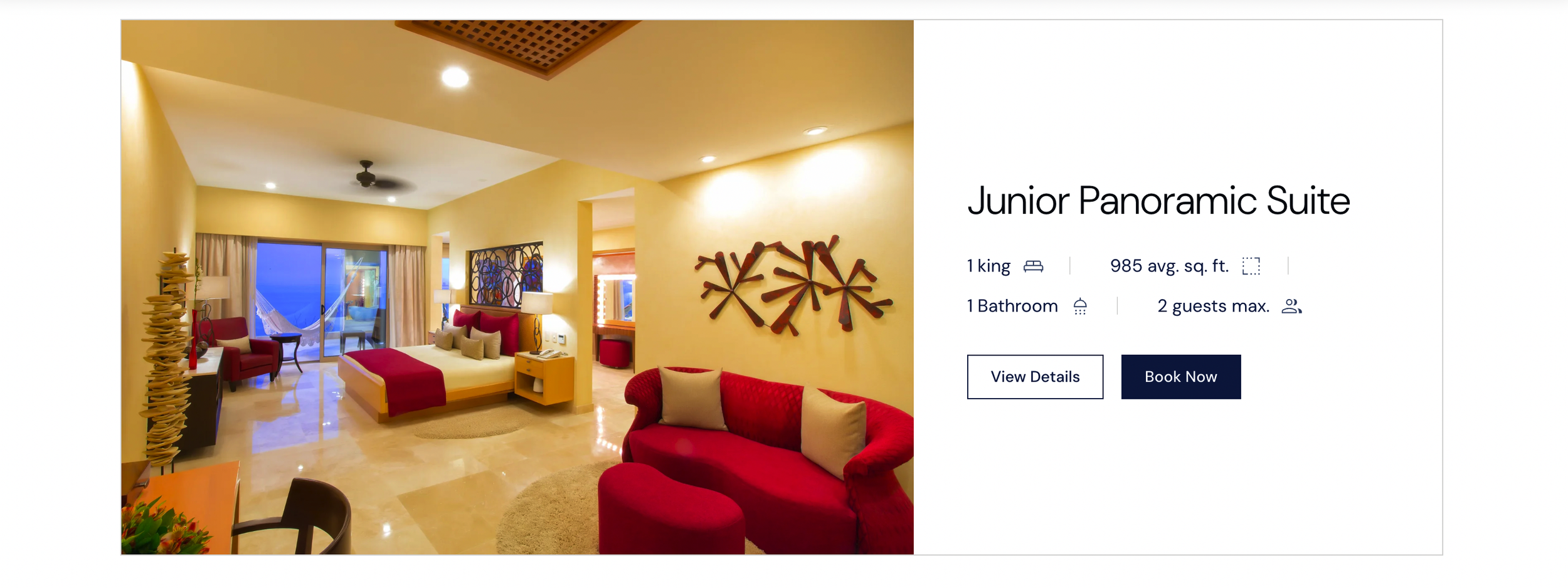1 king| 985 avg. sq. ft.| 1 Bathroom| 2 guests max