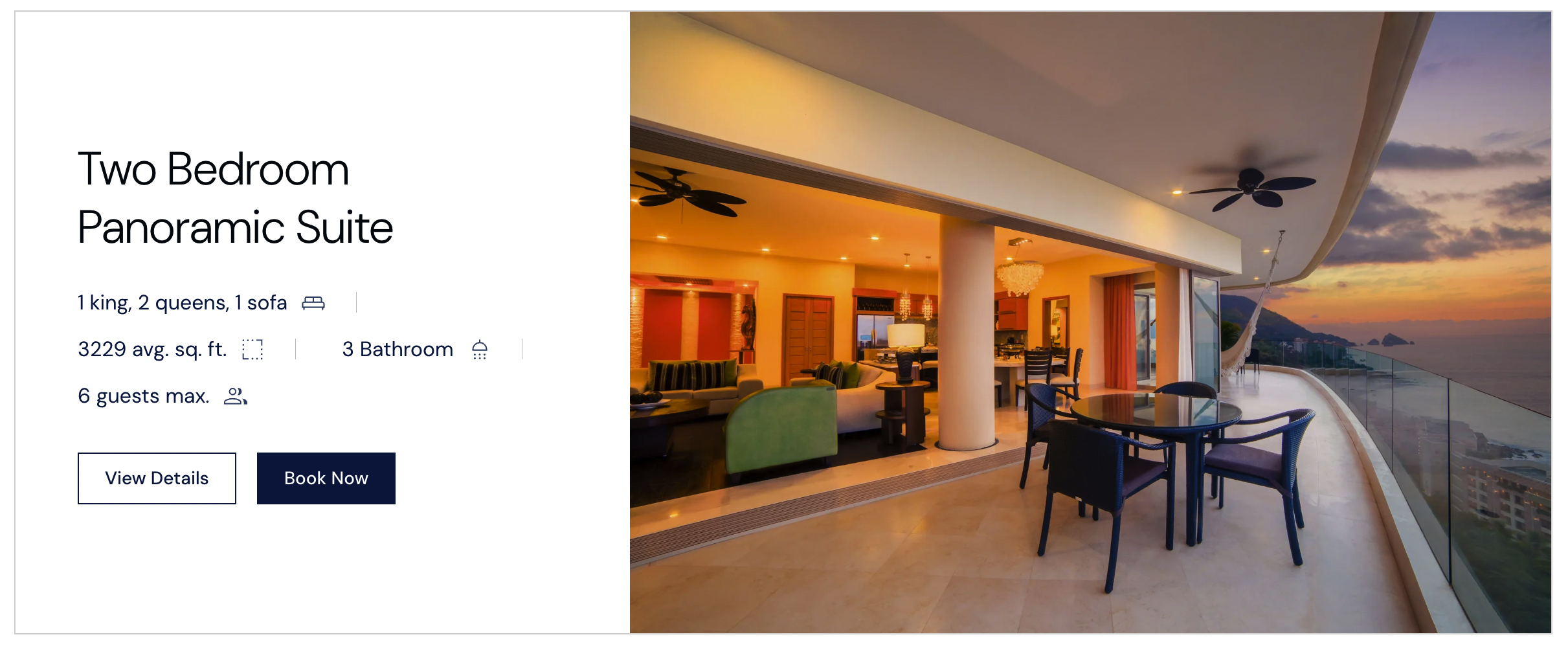 The Vip Guy is pleased to offer one of the most desirable two-room suites in Puerto Vallarta, Mexico. The 3,229 square foot Two Bedroom Panorama Suite will infuse your stay with luxury amidst the abundance of nature with spectacular views of the endless azure ocean and lush green jungle. Panoramic sliding doors open seamlessly along the length of the spacious wraparound terrace, allowing the stunning views of the ocean to merge organically with the stylish interior design. The master bedroom boasts a deluxe king-size bed, oversized bathroom with a chaise lounge, walk-in closet, and private terrace with jacuzzi and ocean views. The suite features a fabulous open floor plan where the gourmet kitchen, dining room, and living room all flow into each other. The dining area seats 8, with additional outdoor seating available. The second bedroom has 2 queen-size beds and a full en suite bathroom. This is one of the best two room suites offered at Puerto Vallarta hotels where you can enjoy spectacular views and breathtaking sunsets.