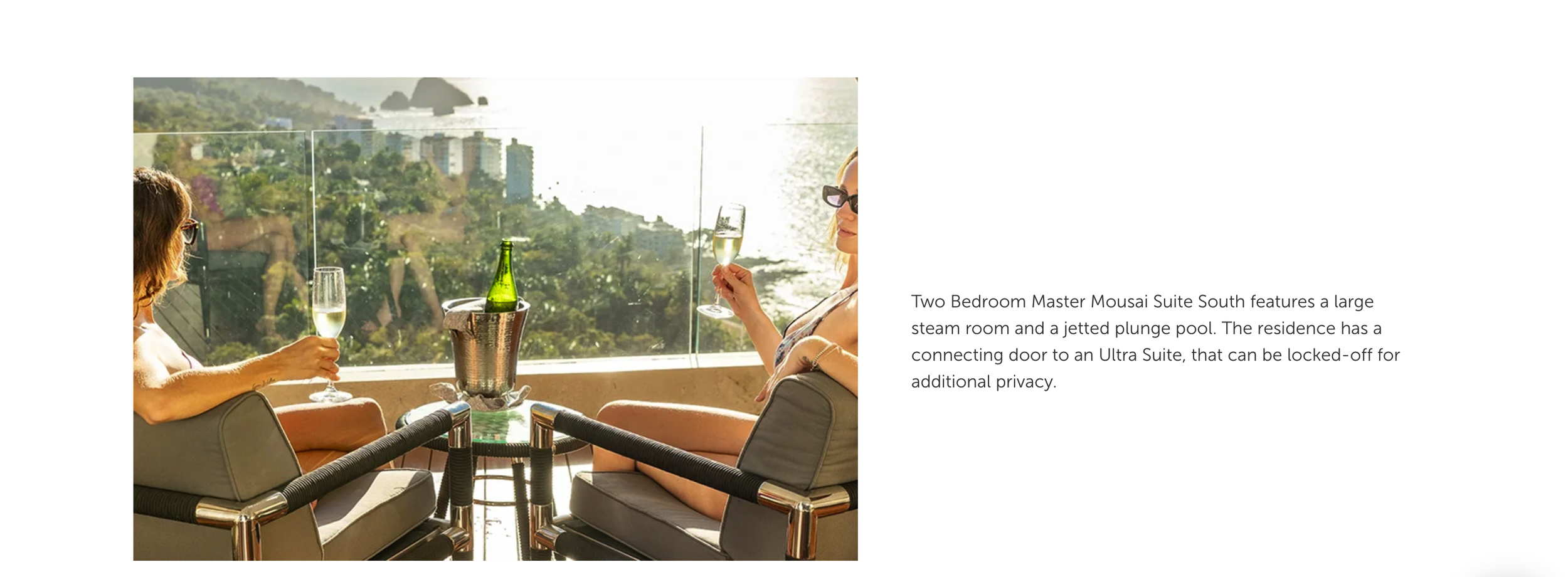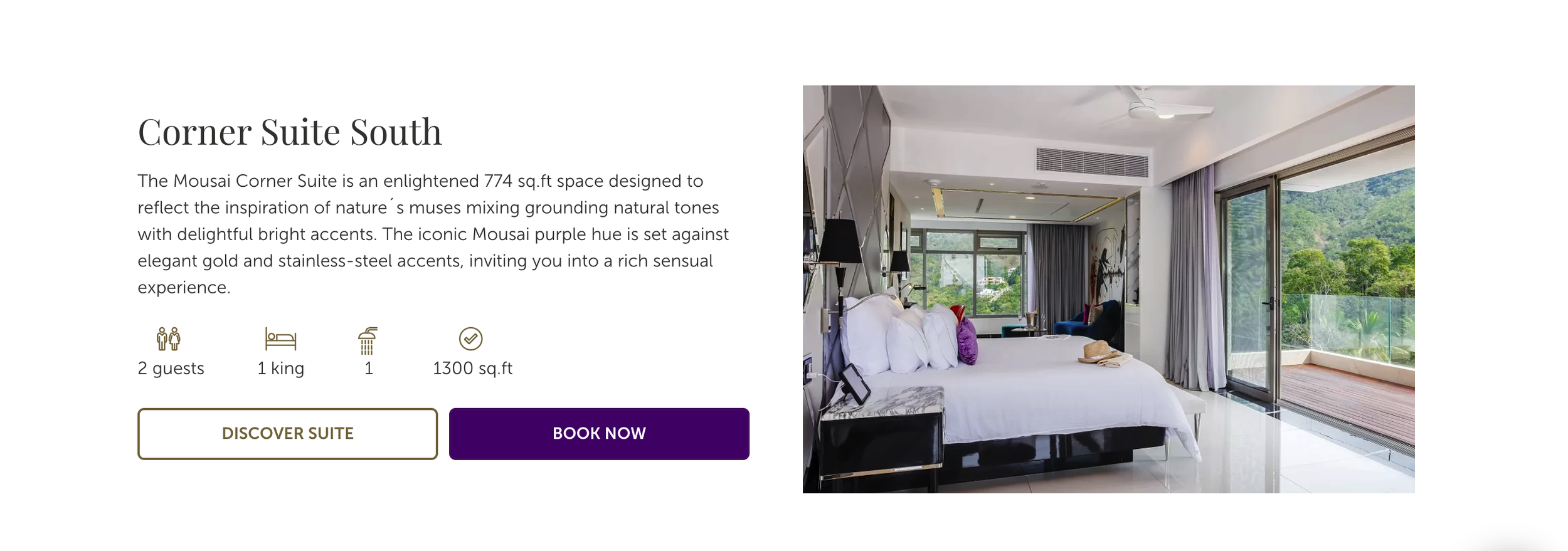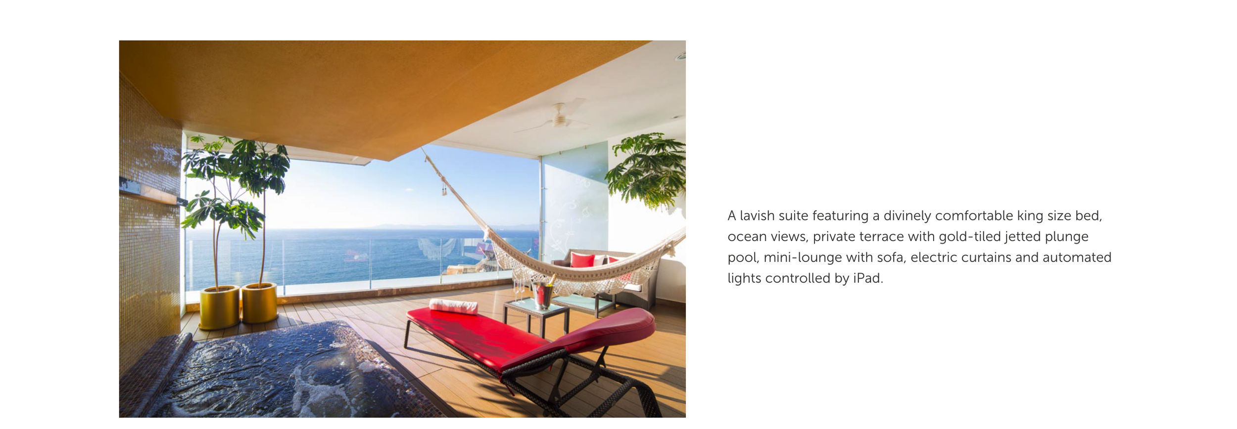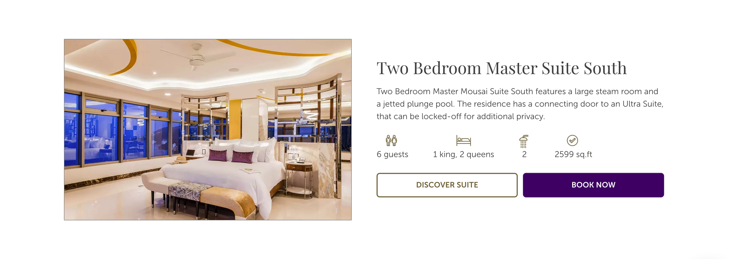 The design of the Master Mousai Suite South allows for fluid and easy navigation with an open-concept design. You can relax like a deity with more than 1,500 sq. ft of indoor and outdoor space. Featuring one bedroom with a king-size bed, living room, modern bar, TV lounge room, spacious bathroom with steam room, and ocean view terrace with jetted plunge pool and hammock.