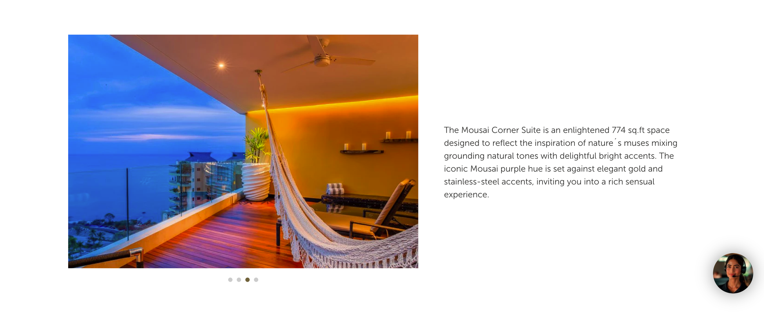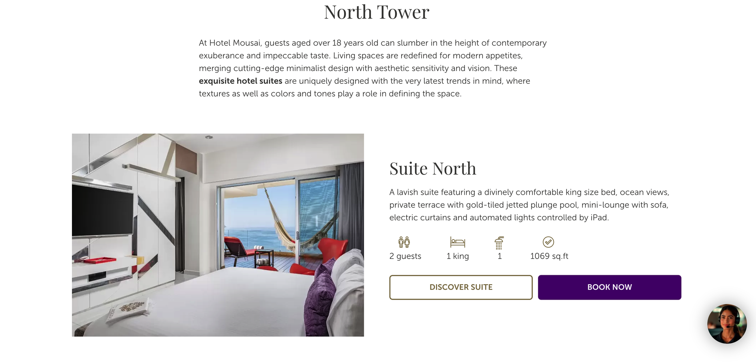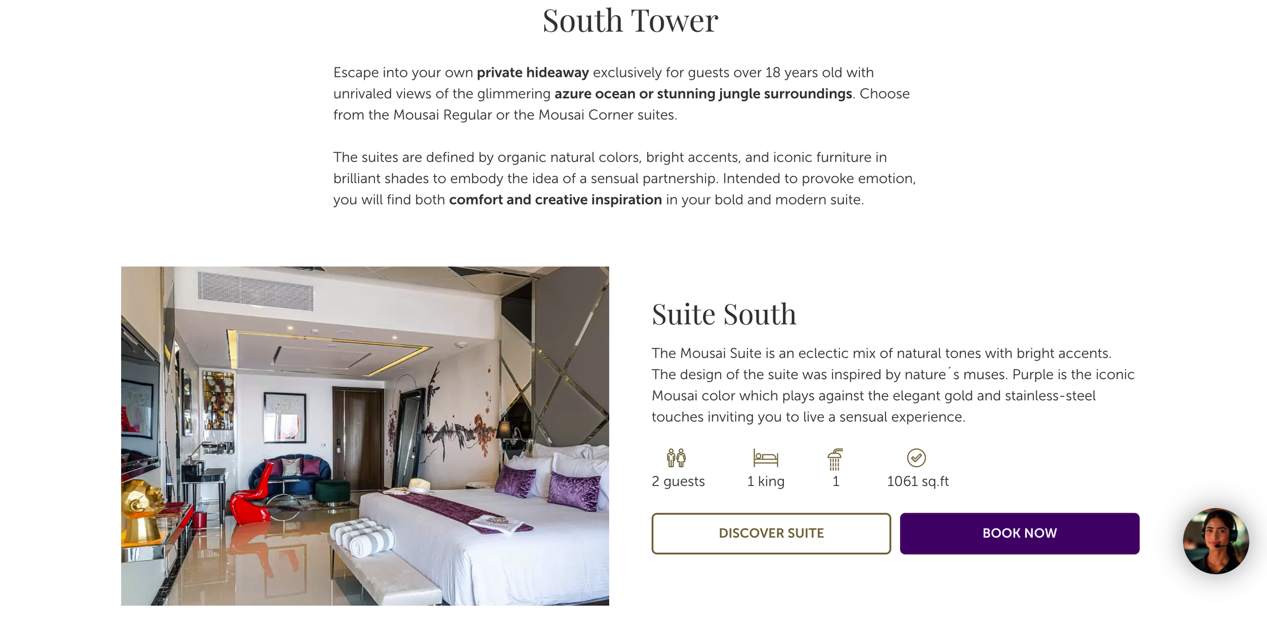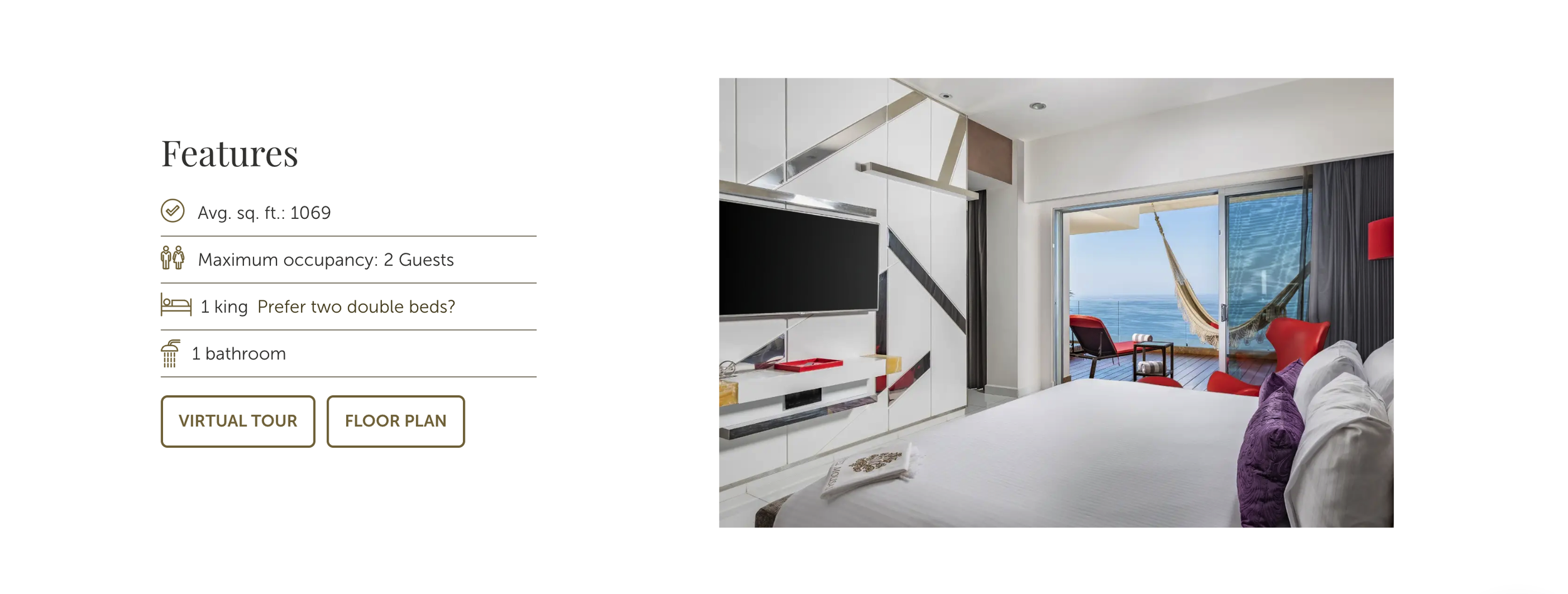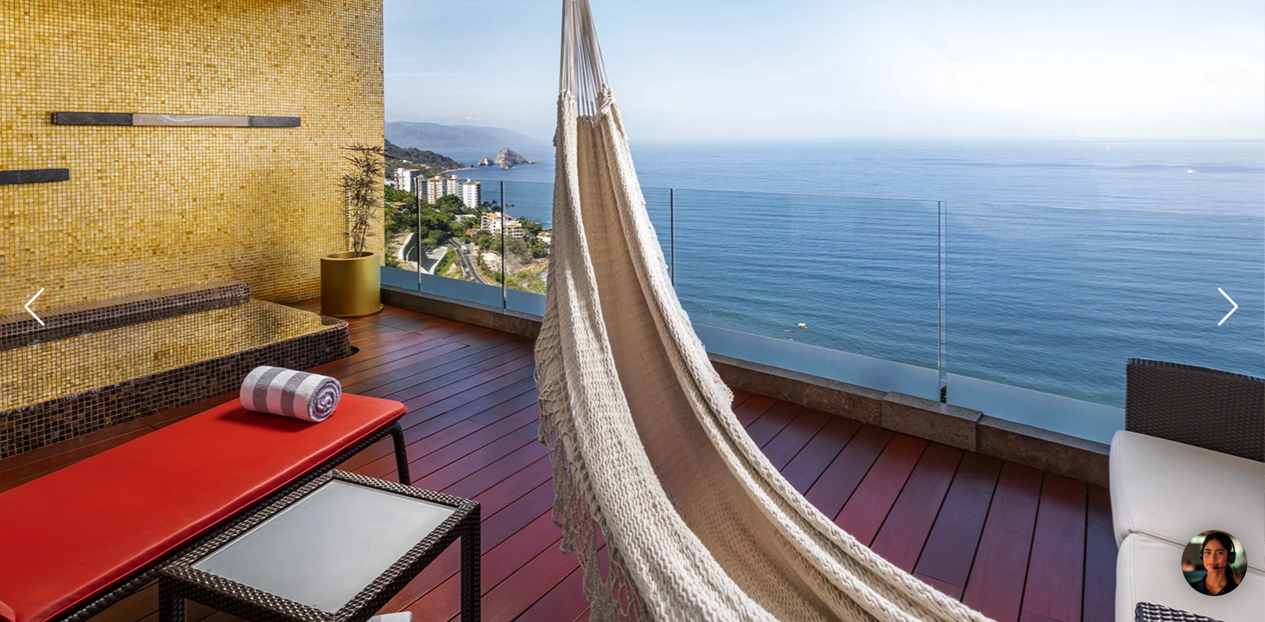 The design of the Master Mousai Suite South allows for fluid and easy navigation with an open-concept design. You can relax like a deity with more than 1,500 sq. ft of indoor and outdoor space. Featuring one bedroom with a king-size bed, living room, modern bar, TV lounge room, spacious bathroom with steam room, and ocean view terrace with jetted plunge pool and hammock.