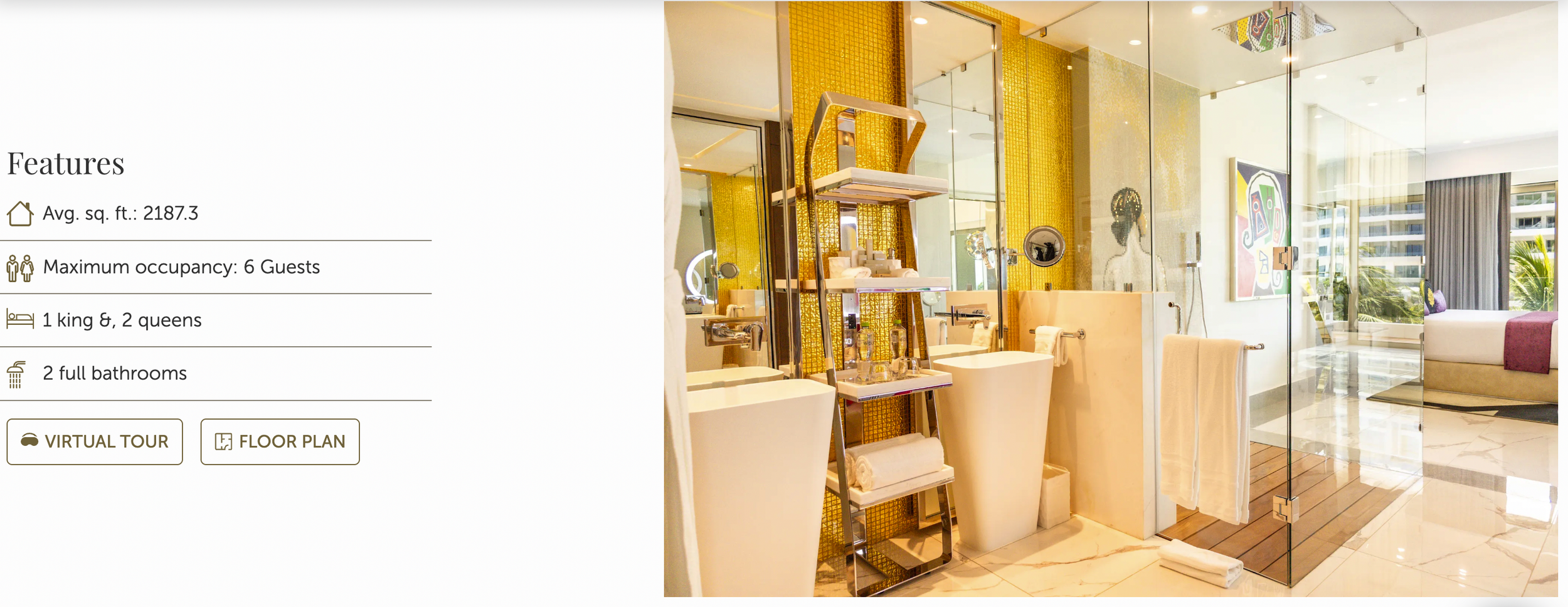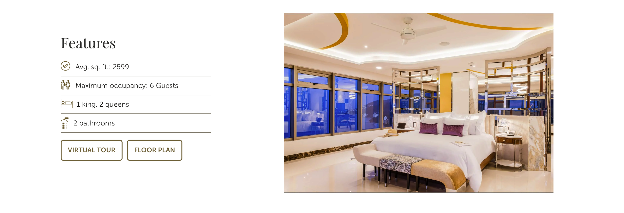 Avg. sq. ft.: 2122 - Maximum occupancy: 6 Guests - 1 king, 2 queens - 2 bathrooms