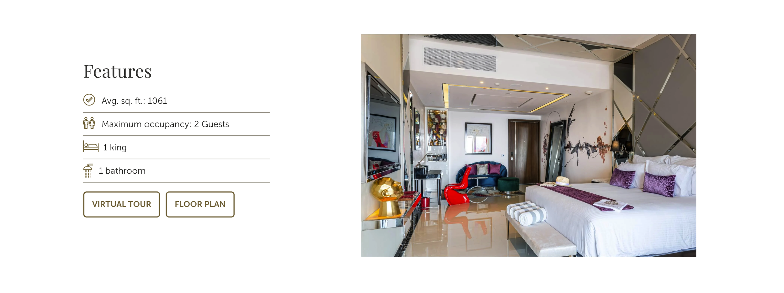 Avg. sq. ft.: 1537 - Maximum occupancy: 2 Guests - 1 king - 1 bathroom