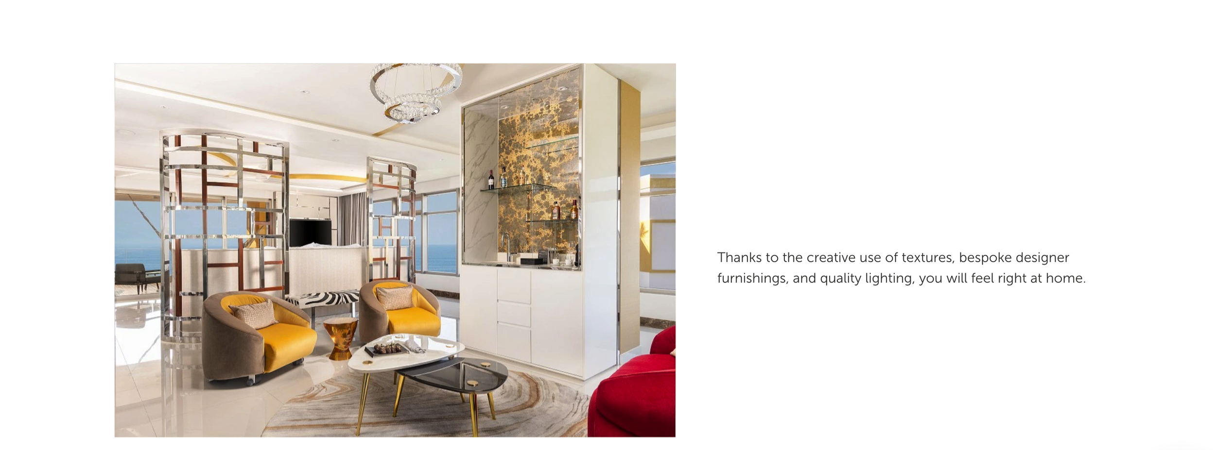 Two Bedroom Master Mousai Suite South has a modern feel with an eclectic mix of natural tones with designer furniture pieces in striking colors, which invite you to live boldly, alongside gold and stainless-steel touches, which reflect elegance. Everything in the suite invites you into a sensual experience where you can feel at peace while getting in tune with the beautiful natural surroundings. The living room’s walls are large floor-to-ceiling windows, which show off nature’s exquisite beauty, which you can enjoy while sipping a cocktail from the modern bar inside the suite.