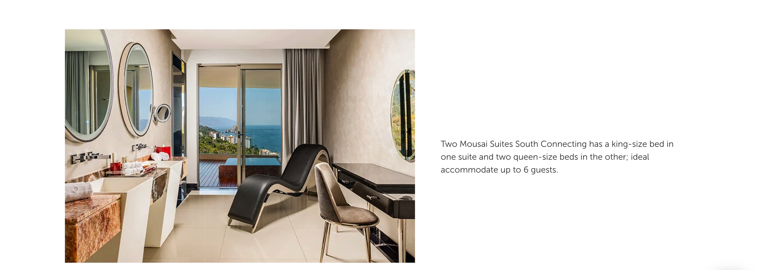 The Master bedroom features a king-size bed, luxurious bathroom with a steam shower, and a spacious terrace overlooking the endless blue ocean with a hammock, jetted hydromassage tub, and sun lounger. The connecting Ultra Mousai Suite features two queen-size beds, a plush sitting area with honor bar and Nespresso machine, a work space, en suite bathroom with rain shower, and its own terrace with hydromassage tub and hammock.