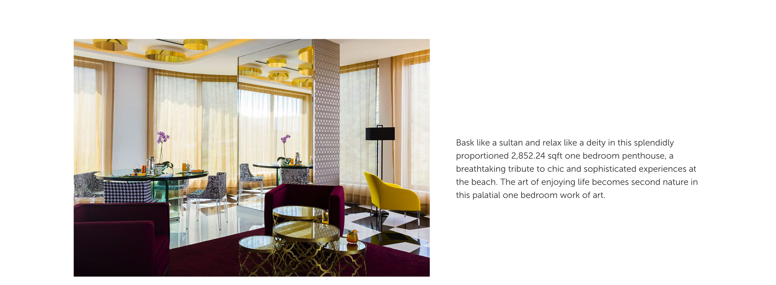 Take center stage within a private ocean and jungle view sanctuary of designer comfort that leaves you quite literally on top of the world. Showcasing the glamorous pomp and majesty bestowed by the grandest penthouses of old with the vibrant pizazz of eclectic contemporary design, the Mousai Penthouse is a breathtaking tribute to chic and sophisticated experiences at the beach. The art of enjoying life becomes second nature in this palatial one-bedroom penthouse.