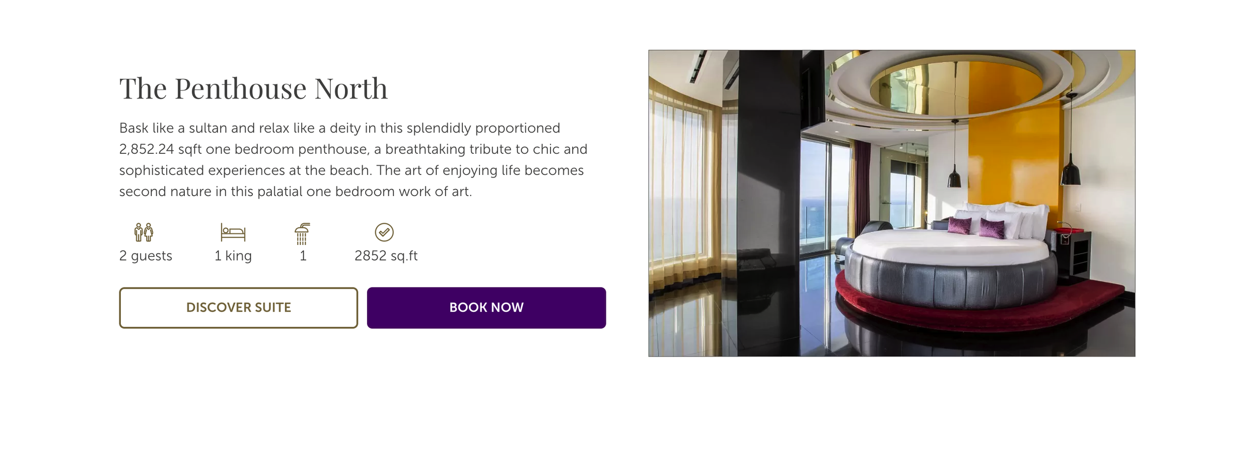 Bask like a sultan and relax like a deity in this splendidly proportioned 2,852.24 sqft (264.98m2) one-bedroom penthouse that features a lavish dining room for two guests, a library, TV lounge with 80” HD LED screen and entertainment center, a modern bar, full kitchen, ocean view terrace with jetted infinity plunge pool and iPad responsive curtains, lighting, and ambiance.