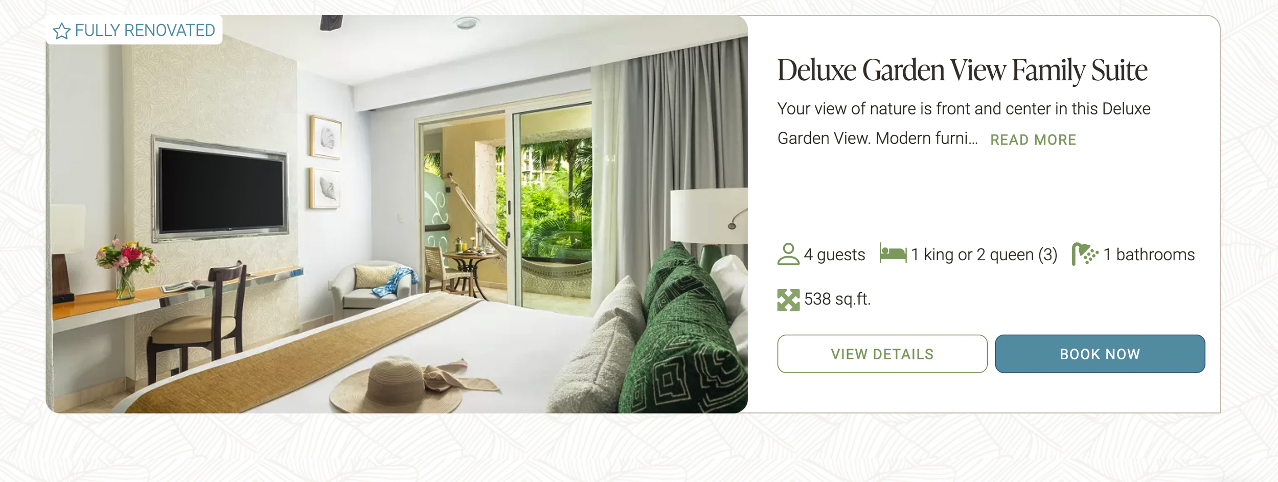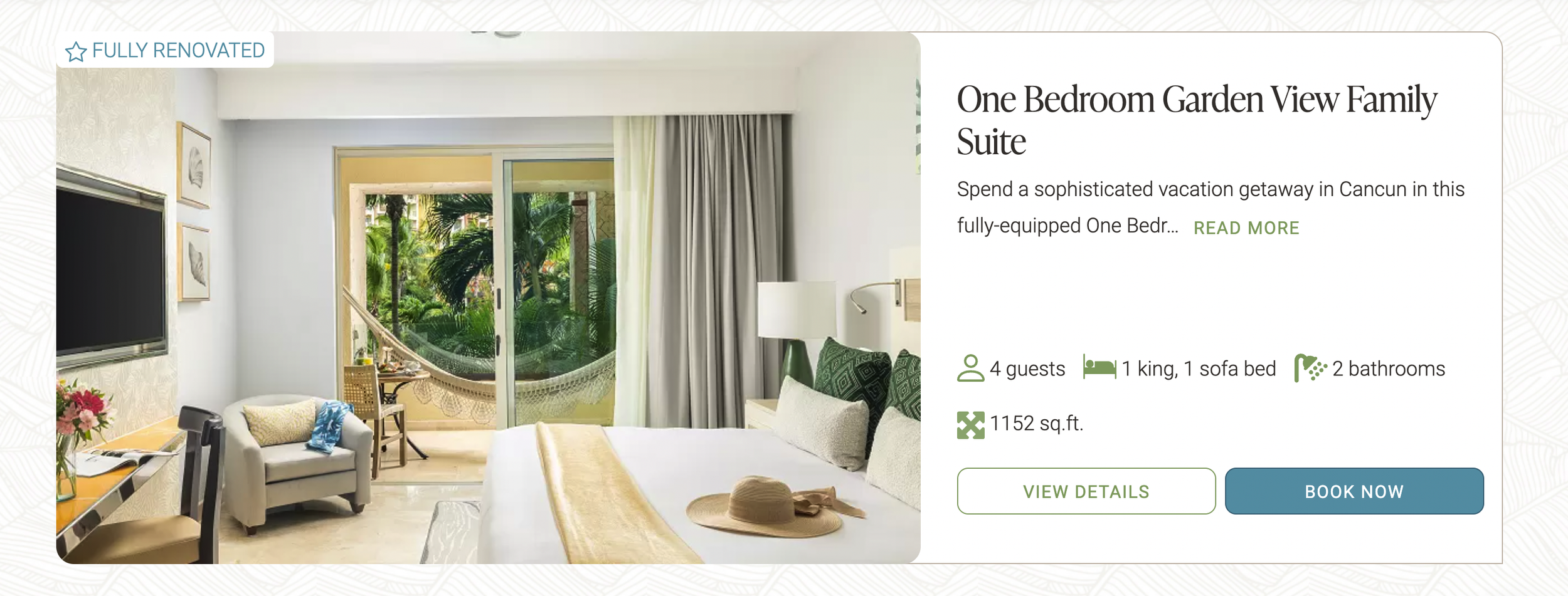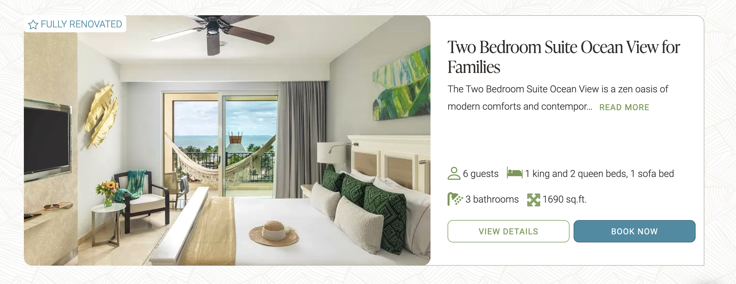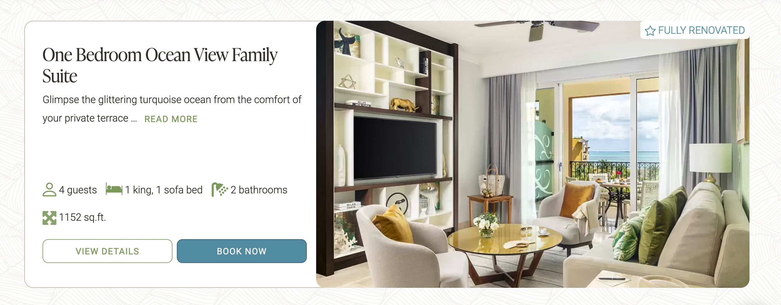 The One Bedroom Suite Ocean View will infuse your stay with tranquil vibes. Surrender to complete relaxation in this spacious 1152-square-foot suite with modern décor featuring warm earthy tones accentuated by vibrant splashes of color, that evoke a sense of calm.
